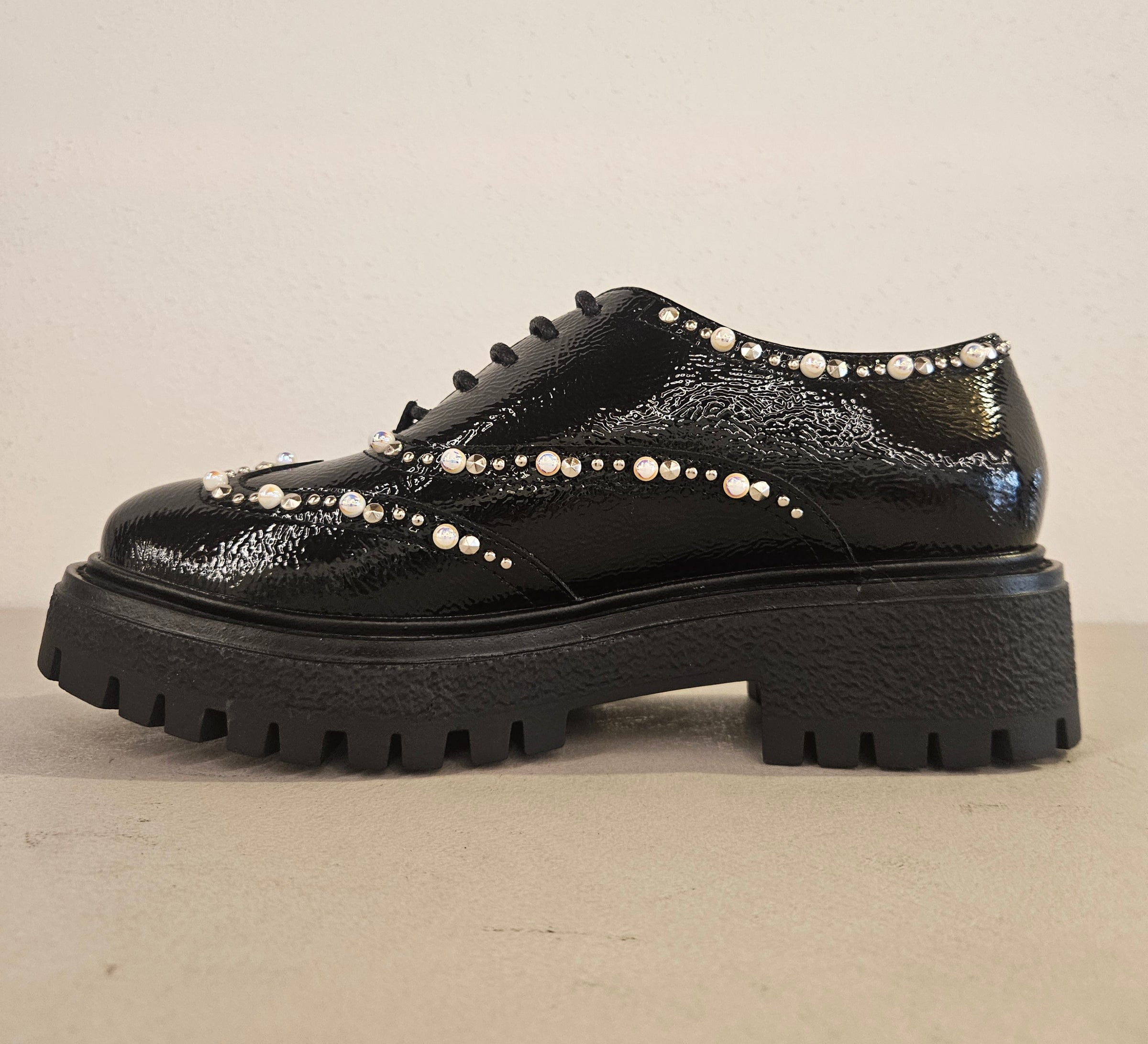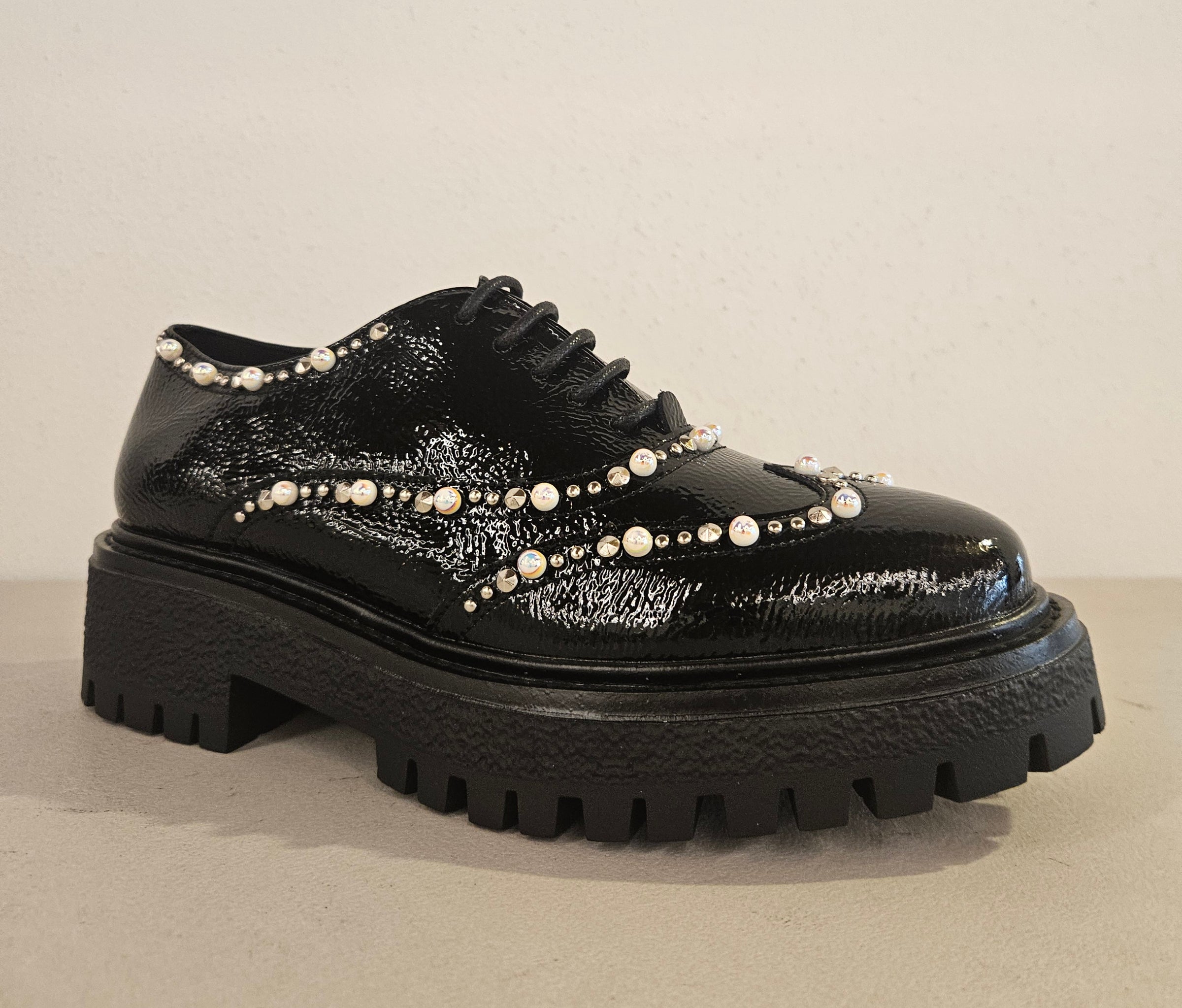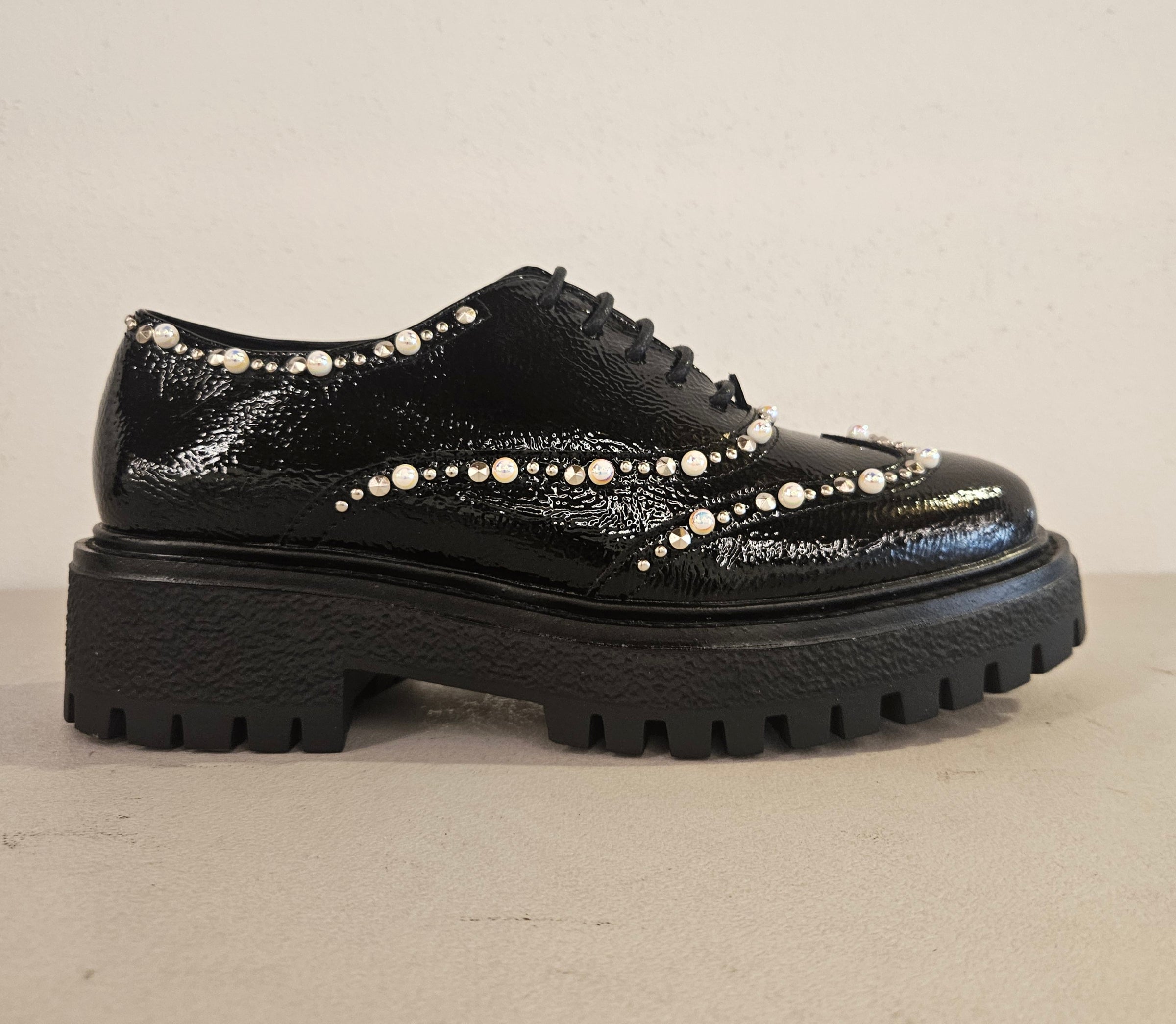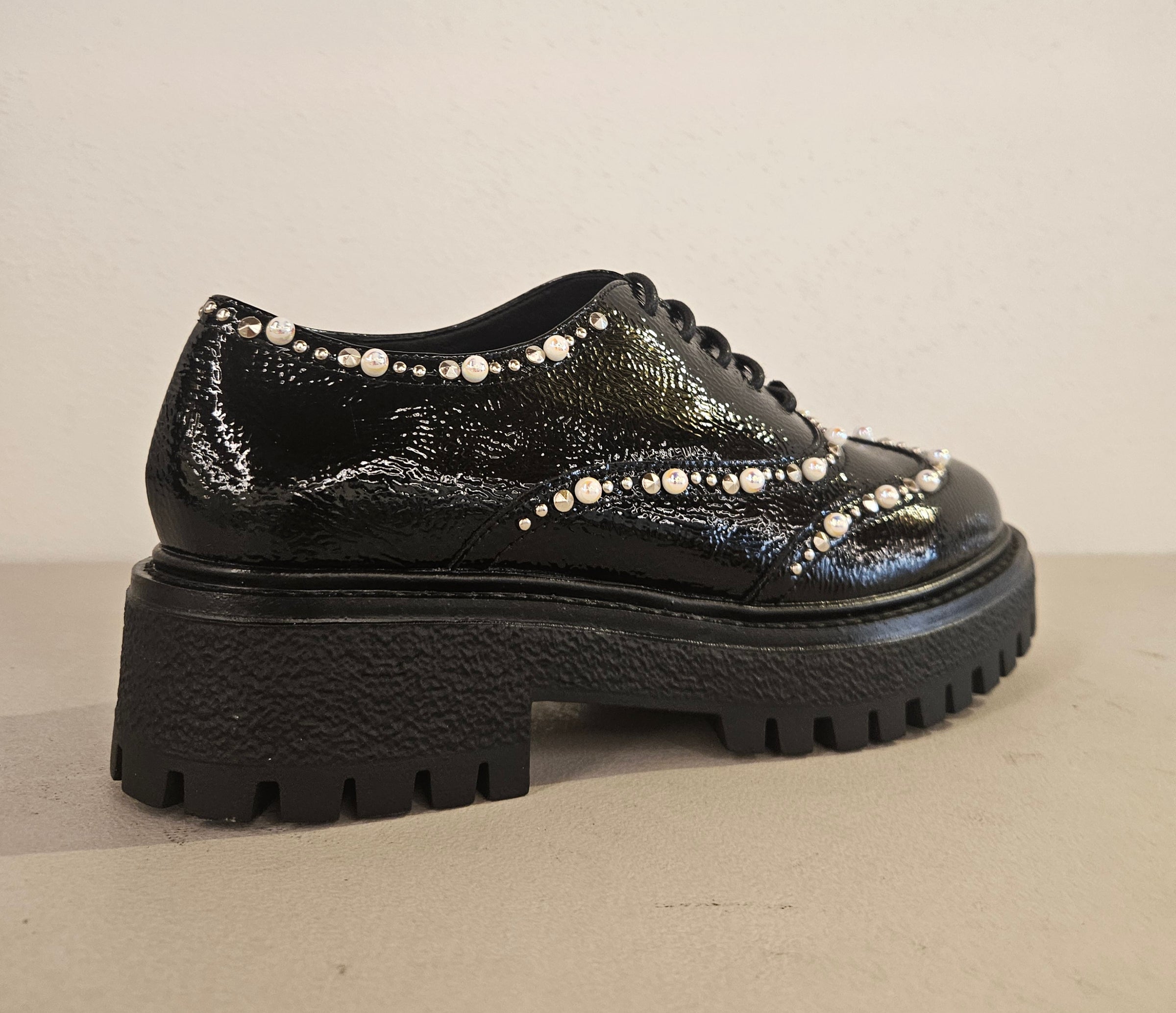 Scarpa stringata in naplak nero con accessori avorio fondo gomma