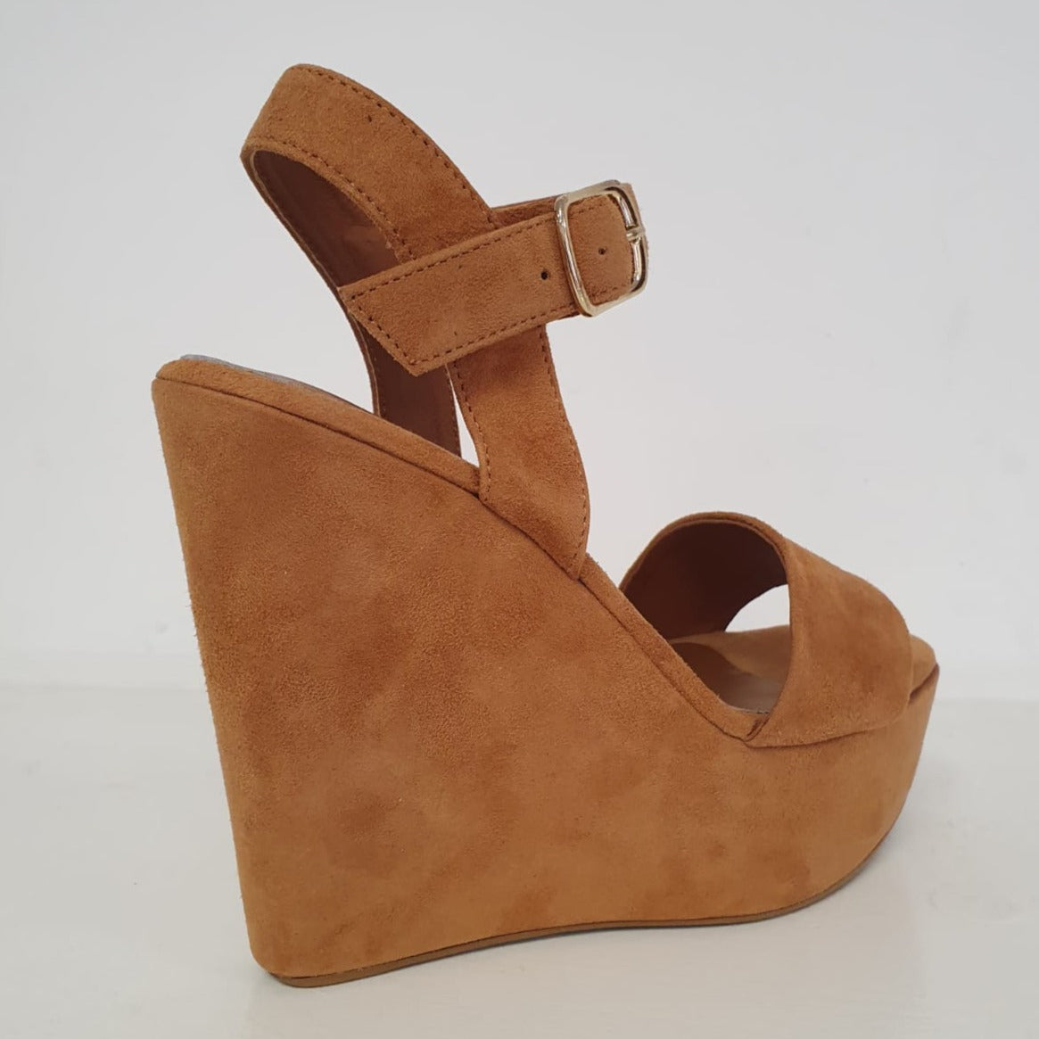 Meravigliosi sandali con la zeppa alta in camoscio color cuoio con cinturino alla caviglia. Tacco 13cm e plateau 4cm. Femminili e di carattere per i tuoi look estivi!
